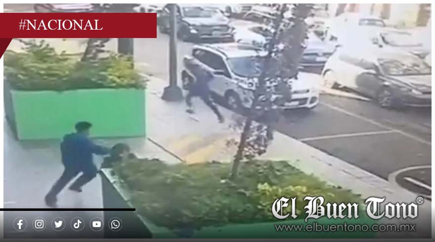 El primero, vestido de negro y con un casco, logra huir del lugar. El segundo, que porta una chamarra azul, tropieza y cae junto a una jardinera. En ese instante aparece un agente de la Policía de Investigación, quien lo somete mientras el joven levanta las manos en señal de rendición. En las imágenes no se aprecia que el detenido porte un arma de fuego.