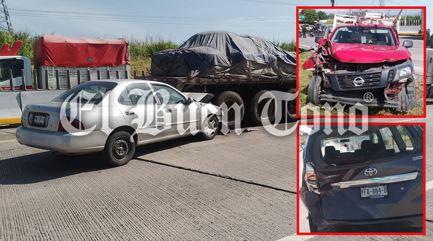 Amatlán, Ver.- Una carambola en la que participó un tractocamión con plataforma, un Nissan Sentra, una Toyota Avanza, una Ram 1500 y una Nissan Estaquitas, ocurrida esta mañana en la autopista Córdoba-Veracruz, a unos 100 metros del trébol de Amatlán, dejó tres personas lesionadas, de las cuales una fue trasladada para su atención médica y hospitalización.