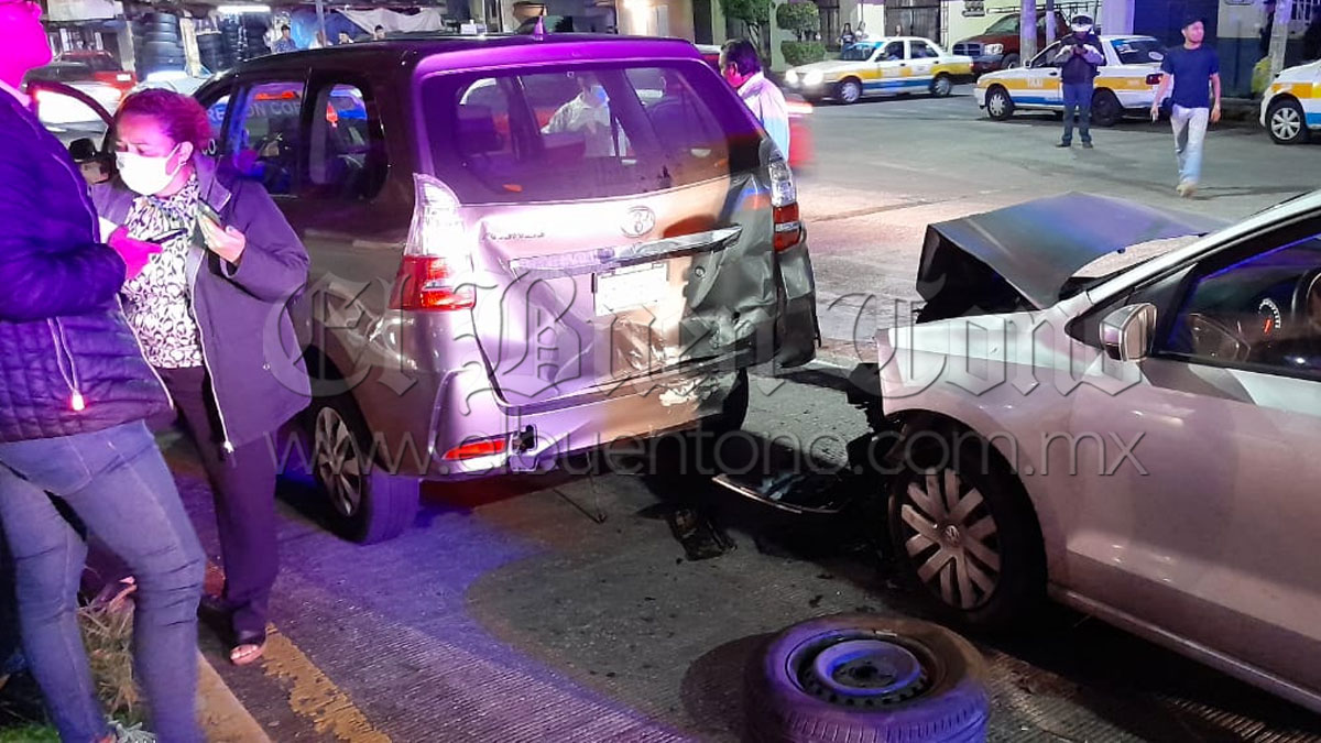 Córdoba, Ver.- Un aparatoso choque y carambola fue el que se registró la noche de este lunes, al chocar por alcance un vehículo Volkswagen-Vento cuyo conductor al circular a exceso de velocidad se impactó contra una camioneta Avanza a la cual proyectó contra el taxi 1579 presentando las unidades severos daños materiales, quedando sobre el carril de alta velocidad, al momento de circular sobre el bulevar Miguel Alemán, a la altura de la calle 31 en la colonia Huilango.