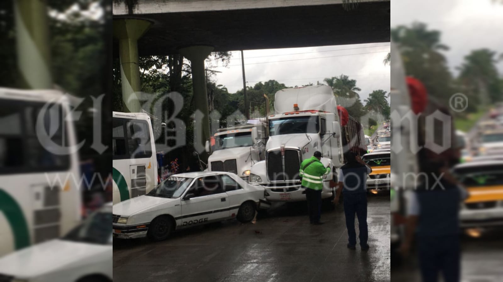 Fortín, Ver.- Una carambola en la que participó un tractocamión con razón social JBL, con tolva, con un automóvil Dodge y u autobús de la línea, Plateados, se registró esta mañana en el bulevar Córdoba-Fortín, a la altura de la zona de tianguis. Durante el accidente no hubo reporte de personas lesionadas, sólo daños materiales y el cierre de la circulación. Peritos de Tránsito Estatal llegaron para tomar conocimiento y realizar el deslinde de responsabilidades.