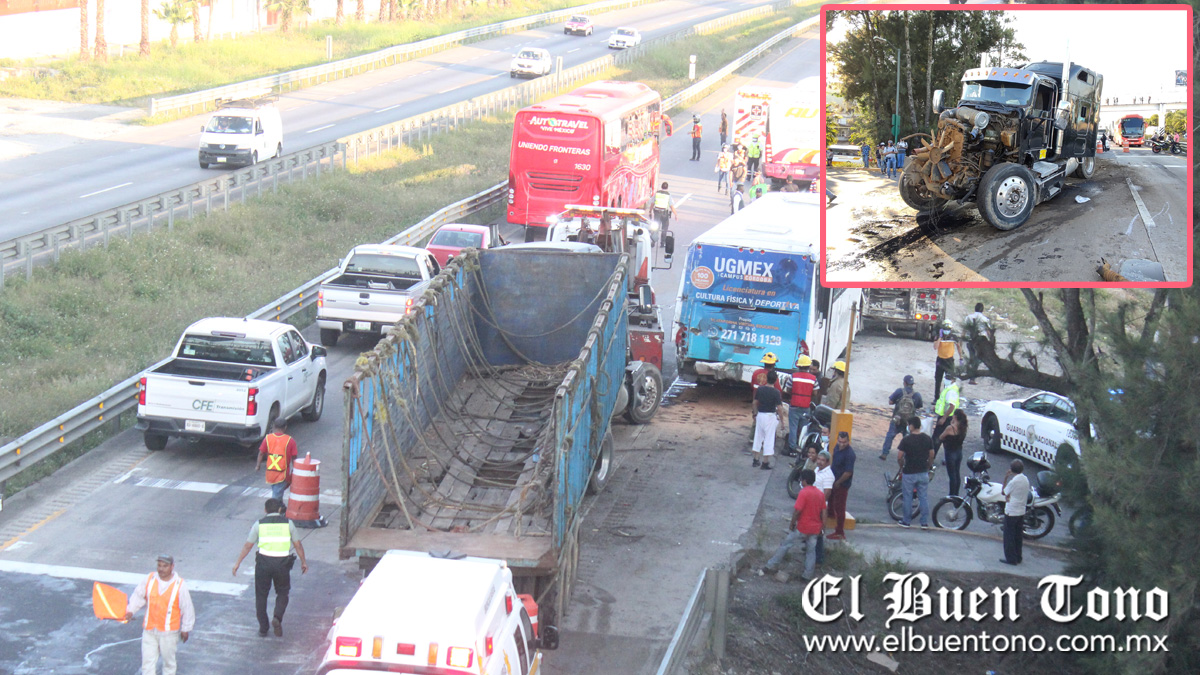 Córdoba.- Díez personas resultaron lesionadas, entre ellas dos de la tercera edad, luego de un aparatoso accidente y carambola en el cual estuvieron involucrados dos autobuses, así como dos tractocamiones cuando circulaban sobre la autopista Orizaba- Córdoba, a la altura del kilómetro 290+500 justo en el puente de la Quebradora, hechos que generaron una fuerte movilización de los grupos de auxilio de la ciudad de Córdoba y Fortín, respectivamente. El percance se registró luego de que presuntamente sufrió una falla mecánica un tractocamión, de la marca internacional sin placas de circulación, el cual presentó rotura de la flecha, motivo por el cual su conductor perdió el control de la pesada unidad, impactando al autobús Torino de la línea plateados con placas de circulación 475-HY-9, el cual a su vez impactó al autobús de la línea AU con número económico 4119 y con placas de circulación 05-HA-7M, para terminar proyectado contra un camión tipo jaula el cual estaba varado, terminando los pasajeros heridos en su interior.