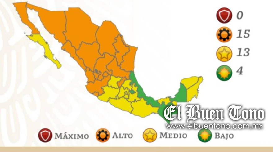 En naranja de riesgo alto estarán Aguascalientes, Baja California, Chihuahua, Coahuila, Colima, Durango, Jalisco, Nayarit, Nuevo León, Querétaro, San Luis Potosí, Sinaloa, Sonora, Tamaulipas y Zacatecas.