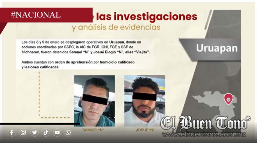 Uruapan, Mich.– La Fiscalía General de la República y la Fiscalía Estatal informaron la detención de dos personas presuntamente vinculadas con el asesinato del alcalde de Uruapan, Carlos Manzo. Entre los detenidos se encuentra Samuel “N”, director de relaciones públicas del equipo del alcalde, quien registra antecedentes penales por lesiones dolosas y robo a negocio.