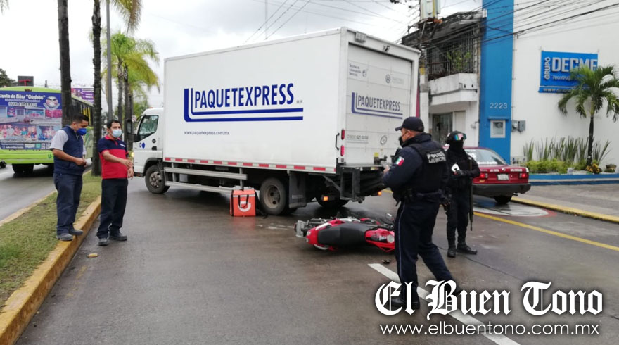CÓRDOBA.- Un motociclista terminó en el pavimento con lesiones siendo atendido por paramédicos de la Cruz Roja y enviado a un hospital, luego de chocar contra una camioneta propiedad de una mensajería sobre el bulevar de la avenida 11 entre calles 22 y 24, de la colonia San José.
