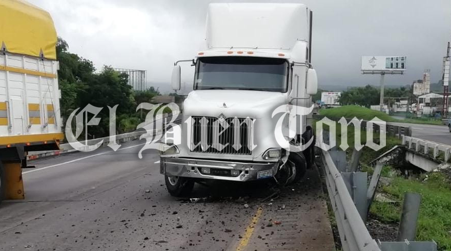 Ixtaczoquitlán.- La fuerte tormenta que cae en toda la región de las Altas Montañas, provocó que el chofer de un tráiler perdiera la visión y chocara contra la barra de contención que está a la altura del kilómetro 287.
