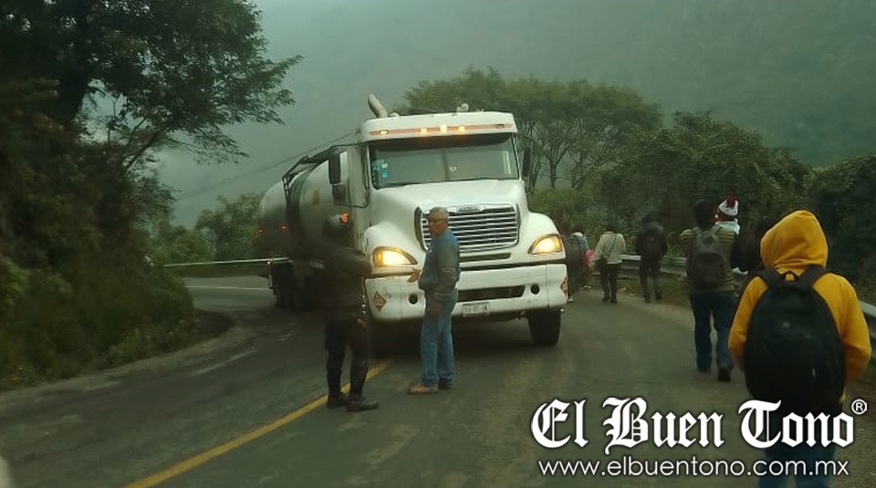 San Andrés Tenejapan, Ver.- Por una falla mecánica una pipa doblemente articulada permanece cerrado en el carril de ascenso en la curva del piojo en la carretera Orizaba-Zongolica a altura del municipio de San Andrés Tenejapan.
