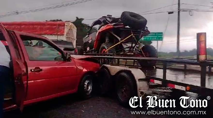 Orizaba– Un adulto y un niño de 8 años fueron atendidos por paramédicos del Samuv en Amatlán después de chocar el automóvil en el que viajaban contra un remolque acoplado a una camioneta que transportaba una cuatrimoto Raiser.