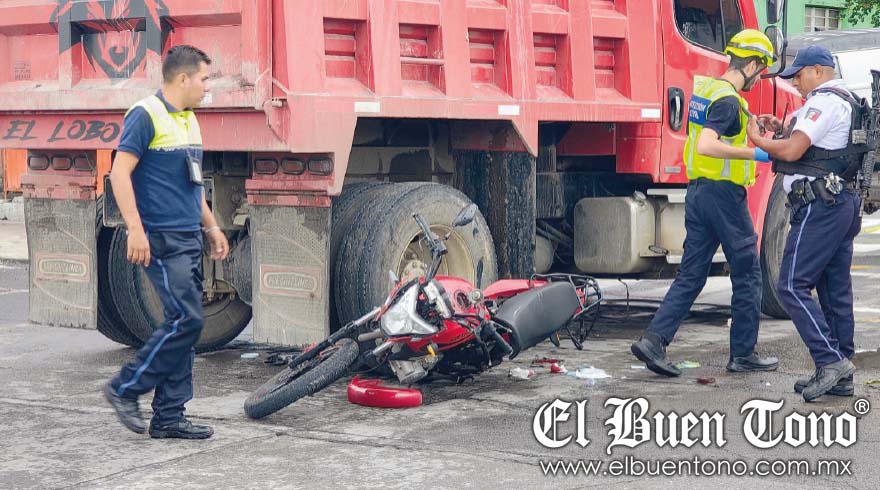Al llegar al cruce con la calle Sur 15, un volteo de color rojo con matrícula XL3200A cruzó la avenida sin hacer un alto total. El conductor del volteo no se percató de la llegada de la motocicleta, que se vio obligada a cambiar de carril de forma intempestiva y no pudo frenar a tiempo y colisionó contra las llantas traseras del volteo, lo que arrojó que sus ocupantes resultaran lesionados.