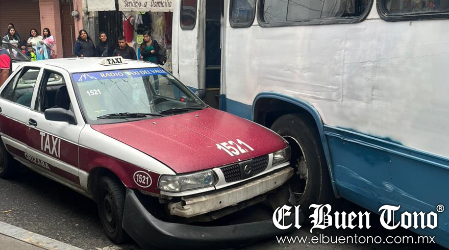 Orizaba. – Un taxi, marcado con el número económico 1521, se vio involucrado en un choque la tarde de este domingo con un autobús de pasajeros. El incidente tuvo lugar en Oriente 9 Norte 2, cuando el conductor del taxi estaba realizando una vuelta en U y colisionó lateralmente con el camión de pasajeros.