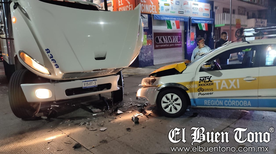Córdoba.- Un fuerte choque se registró la mañana de este domingo en la avenida 1 calle 19, donde se vio involucrado un taxi marcado con el número económico CO-2469, el cual impactó de frente con un tráiler de Trate Logística con número 8368.