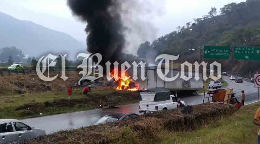 Nogales.- Un tráiler se incendió luego de que el conductor de la pesada unidad perdiera el control y chocara contra un montículo de tierra en el carril de subida de la autopista Orizaba-Puebla, a la altura del ramal que conduce hacia Nogales-Ciudad Mendoza.