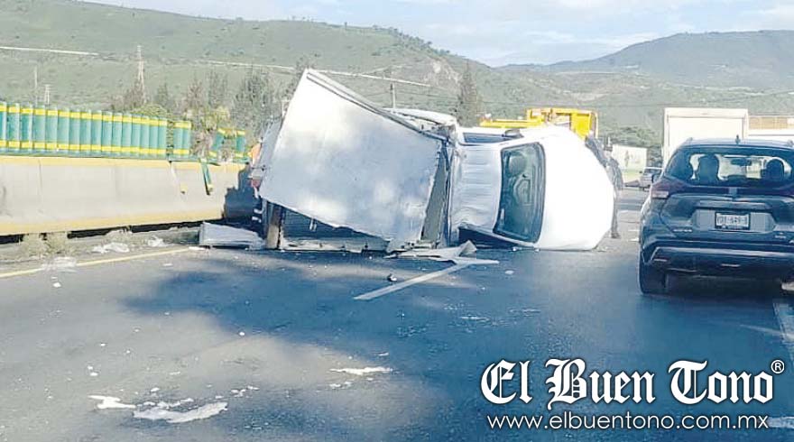 El conductor de una camioneta en color blanco, tipo NP 300, perdió el control de la unidad por viajar a exceso de velocidad y terminó impactado contra el muro de contención, lo que orilló a que volcara y quedara atravesada sobre el carril de alta velocidad.