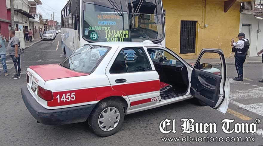 ORIZABA.- Un choque entre un autobús y un taxi ocurrió la mañana de este domingo en el cruce de la Norte 10 y Oriente 5 en la colonia Centro, sin que se reportaran personas lesionadas pero sí daños materiales.