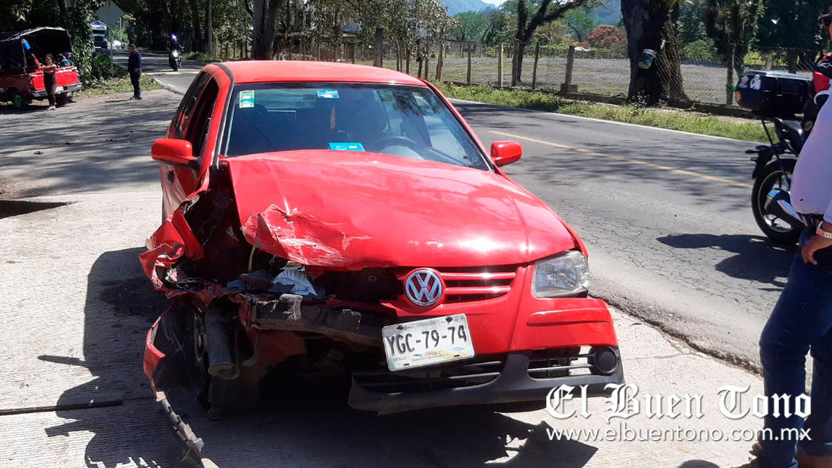 El percance se registró la tarde de ayer sábado, sobre la carretera federal a Huatusco, a la altura de la comunidad Dos caminos, cuando el conductor del pointer circulaba con rumbo Coscomatepec de Bravo, al pasar por una zona de topes, los cuales fueron recientemente colocados, no se percató de ellos, por lo que se los voló y provocó que lo impactara la camioneta.