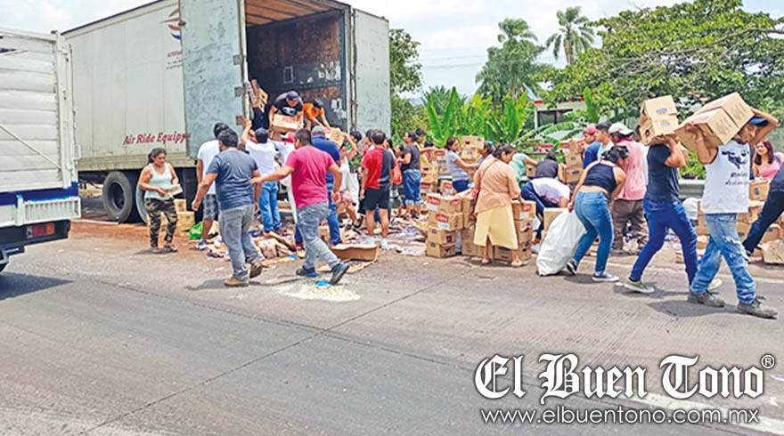 Ixtaczoquitlán.- El conductor de un camión que transportaba abarrotes, chocó por alcance contra un torton de color rojo y debido al fuerte impacto, la caja de la unidad se abrió y la gente aprovechó para robar el producto en la autopista Puebla-Córdoba, a la altura de la localidad Sumidero.