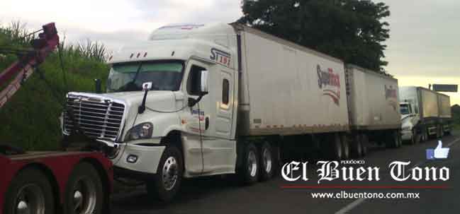 Esta unidad se impactó contra con un tráiler cargado con cerveza, el cual tuvo daños mínimos y continuó su camino, por lo que sólo el tractocamión dañado fue remolcado por una grúa.