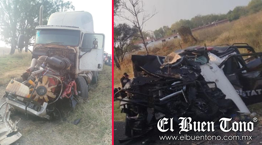 Jalisco.- La mañana del sábado, un grave accidente en la carretera estatal Teocaltiche-Jalostotitlán resultó en la muerte de dos oficiales de la Secretaría de Seguridad Pública del Estado y dejó a otros dos heridos de gravedad. El incidente ocurrió a tan solo dos kilómetros de Teocaltiche, cuando una patrulla, una camioneta Chevrolet con número económico CP-002, colisionó de frente con un tráiler que remolcaba una góndola.