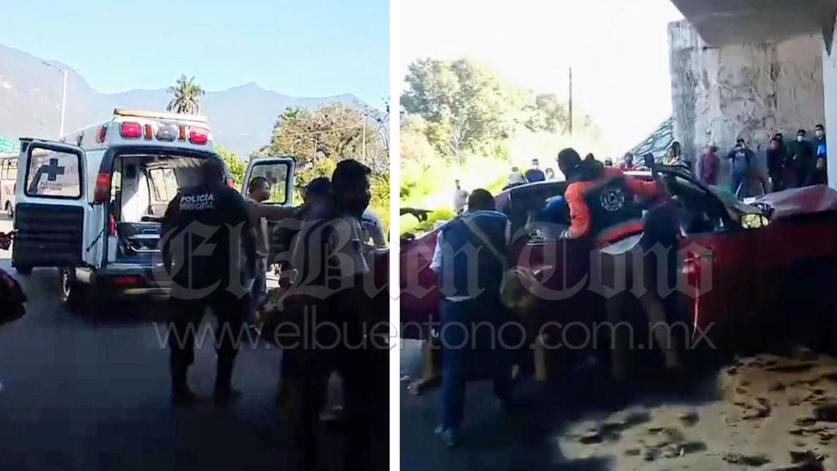NOGALES.- Un accidente automovilístico se registró sobre la avenida principal, precisamente a la altura de distribuidor vial que conecta al municipio con la autopista, cuando el conductor de un vehículo particular tras perder el control del volante se impactó contra una de las bases del puente dejando a cinco viajeros heridos, al lugar acudieron elementos policiales, así como Paramédicos adscritos a Protección Civil así como de la Cruz Roja base Ciudad Mendoza.