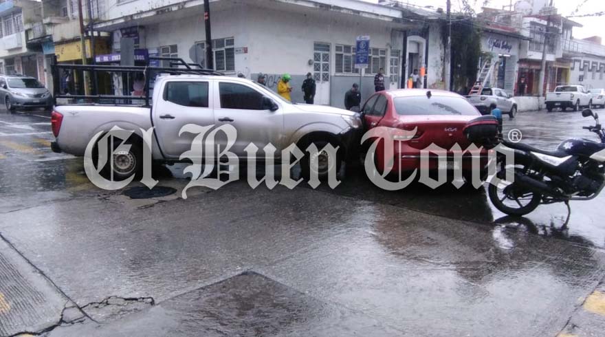 Córdoba, Ver.- Un choque entre una camioneta Nissan doble cabina y un automóvil Kia, ocurrido en la avenida 7 y calle 7, dejó solo daños materiales y el cierre de la circulación. Autoridades policiacas llegaron para abanderar la circulación y un perito para tomar conocimiento y llevar a cabo el deslinde de responsabilidades.