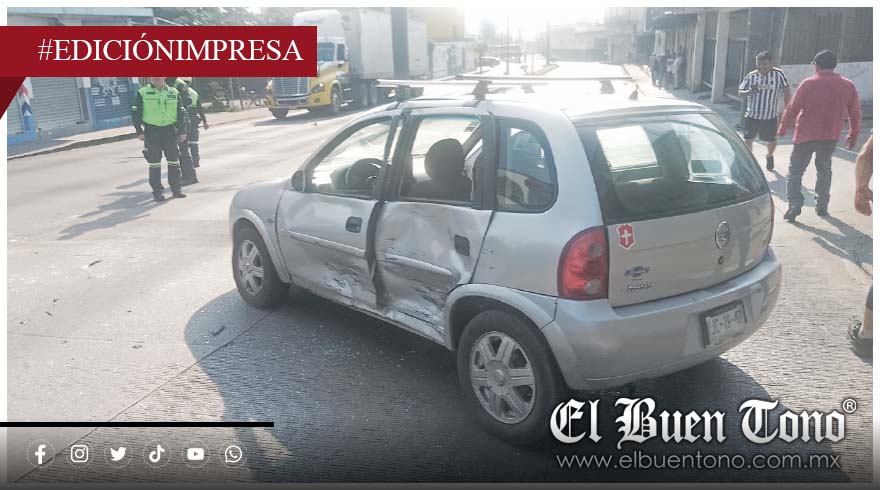 El accidente ocurrió al momento en que el vehículo gris, con placas YJC-1947, salía por la calle. Al mismo tiempo, una camioneta de color negro, con placas de circulación XK-2576-B, subía por la avenida e impactó al vehículo en su costado izquierdo, causando daños considerables.