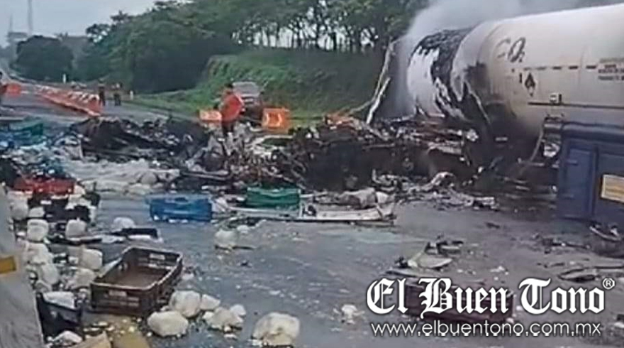 Acayucan, Ver.- Un choque registrado durante la mañana de este jueves entre un tractocamión con doble tanque, con razón social Liquid, otra unidad de carga pesada, dejó como saldo un incendio y como consecuencia de ello, una persona fallecida, en la autopista Ciudad Isla-Acayucan.