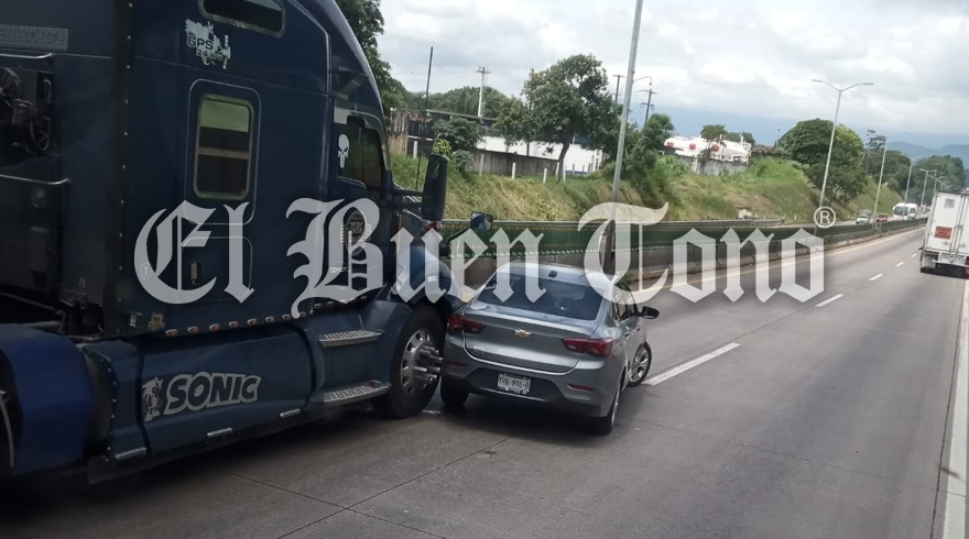 Fortín, Ver.- Un tractocamión impactó a un automóvil Chevrolet al momento en que su conductor intentó tomar el carril de alta sin tomar las debidas precauciones, esta mañana de viernes en la autopista Córdoba-Orizaba antes de llegar al puente de Metlac.