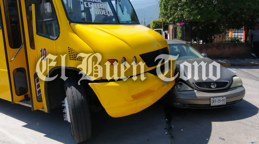 Río Blanco.- Un aparatoso accidente se registró la tarde de hoy en calles de la colonia Modelo, luego de que un auto particular se estrelló de costado contra un autobús de pasaje urbano de la línea Garitas, dejando como saldo únicamente daños materiales.