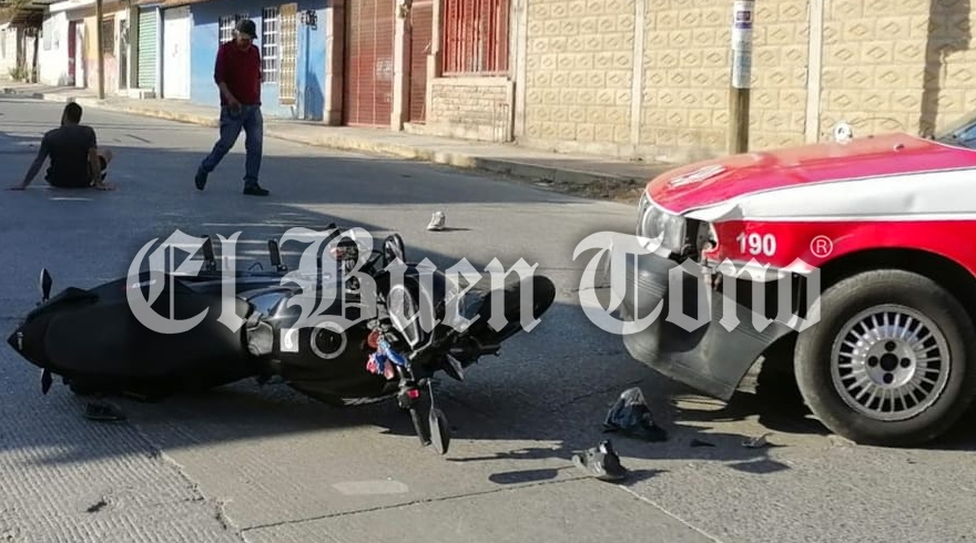 Ciudad Mendoza.- Un aparatoso accidente entre una moto y un taxi se registró la tarde de este martes en el cruce de las calles Ignacio Allende y Ricardo Flores Magón, de la colonia Obrera.