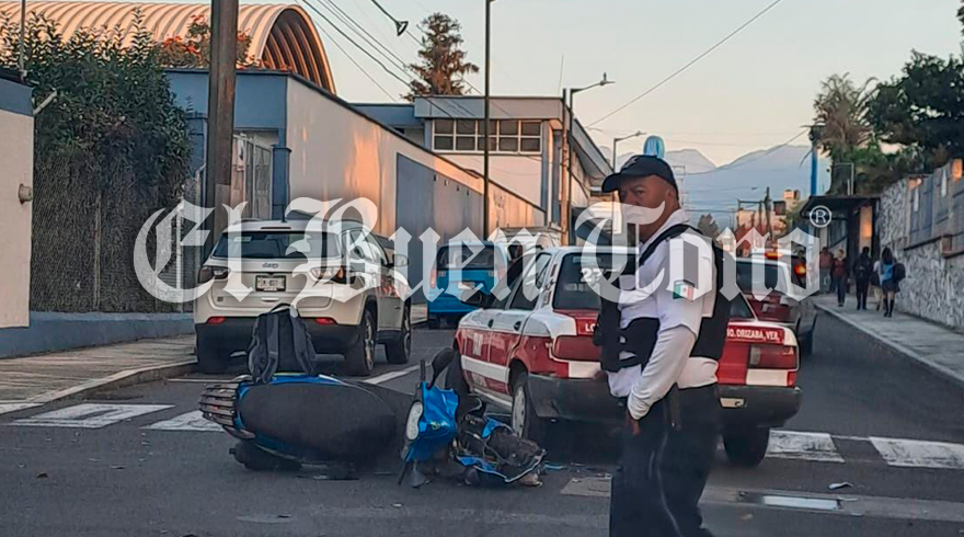 Orizaba, Ver.- El choque entre una motoneta y un taxi local, ocurrido esta mañana en Oriente 5 con norte 24 de la colonia México, dejó una persona lesionada, no de gravedad, y el cierre de la circulación.