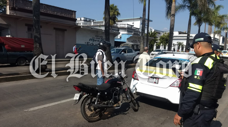 Córdoba, Ver.- Un choque entre el taxi número CO-909 y una motocicleta, que dejó daños materiales mínimos, provocó el cierre de la circulación en un carril de la avenida 11, entre calles 13 y 15, esta mañana de miércoles.