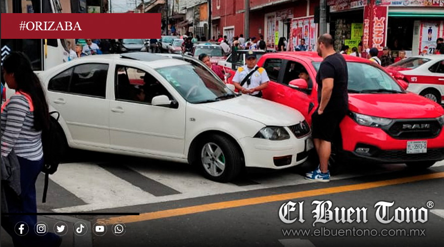 Orizaba, Ver.— La tarde de este sábado se registró un choque por alcance en la esquina de la Oriente 7 y Norte 2, a unos metros del mercado Melchor Ocampo, en pleno centro de la ciudad de Orizaba, Veracruz, una zona de alta afluencia peatonal y vehicular.