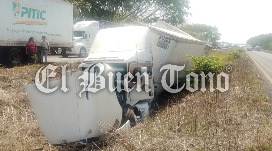 Cotaxtla, Ver.- Un tráiler con doble caja seca se salió del camino y terminó seriamente dañado en la cuneta central, luego de chocar contra una camioneta, durante la mañana de este martes a la altura del kilómetro 34 de la autopista La Tinaja-Cosamaloapan.