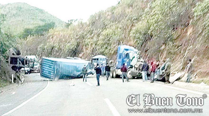 Maltrata.- Un tráiler quedó destrozado en la autopista Puebla-Orizaba después de chocar contra un cerro y volcarse, en las cercanías de las Cumbres de Maltrata.