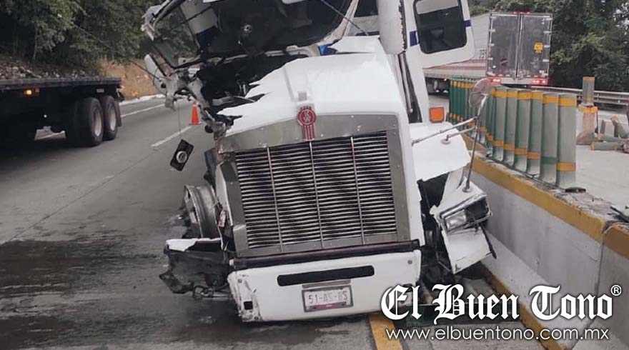 Antes de llegar a la caseta, la pesada unidad fue impactada por otro tráiler, lo que provocó que se proyectara contra el muro de contención central, causando daños.