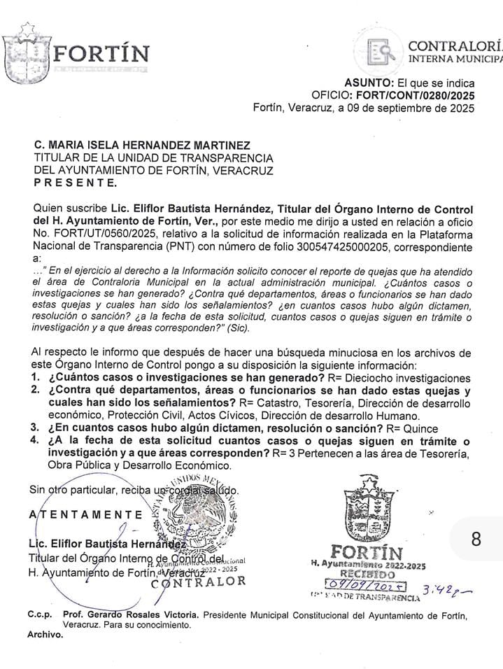Fortín, Ver.- La Contraloría Municipal del Ayuntamiento de Fortín ha admitido la existencia de dieciocho investigaciones por quejas durante esta gestión, de las cuales solo quince han sido resueltas y tres permanecen en la opacidad, pendientes de dictamen.