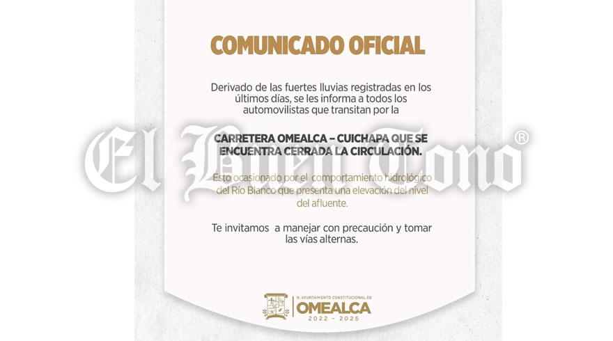 Omealca.- Derivado de las fuertes lluvias registradas en las últimas horas el caudal del río Blanco se encuentra elevado y esto ocasiona que al golpear la fuerza del líquido sobrepase el puente que comunica congregaciones de Cuichapa a Omealca, aún cuando no está cerrado el paso las autoridades municipales exhortan a transitar por este lugar con precaución para evitar un accidente.