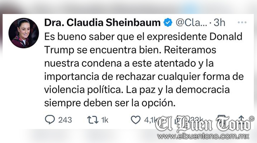 Nacional.- La virtual presidenta electa de México, Claudia Sheinbaum Pardo, expresó su alivio por el estado de salud del expresidente de Estados Unidos, Donald Trump, tras el atentado que sufrió durante un mitin en Pensilvania el sábado. En redes sociales, Sheinbaum destacó la importancia de rechazar la violencia política y enfatizó que la paz y la democracia deben ser siempre la opción.