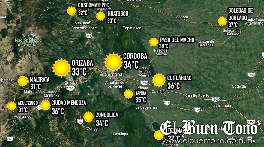 Un sistema anticiclónico en niveles medios de la atmósfera mantendrá condiciones estables y ambiente muy caluroso en gran parte del país, con temperaturas máximas de 40 a 45 grados Celsius en zonas de Guerrero, Hidalgo, Morelos, Oaxaca, San Luis Potosí, Tamaulipas y Veracruz; de 35 a 40 grados Celsius en Campeche, Chiapas, Coahuila, Colima, Jalisco, Michoacán, Nuevo León, Puebla, Querétaro, Tabasco y Yucatán, y de 30 a 35 grados Celsius en Aguascalientes, Durango, suroeste del Estado de México, Guanajuato, Nayarit, Quintana Roo, Sinaloa y Zacatecas.