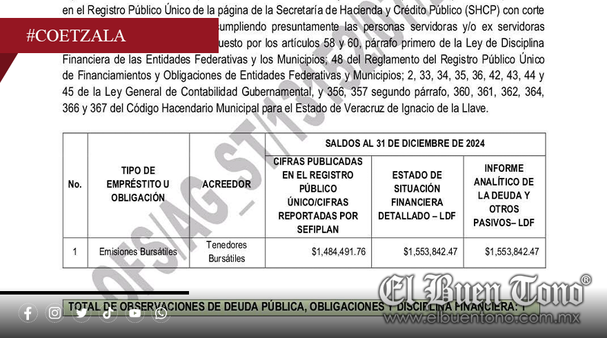 El municipio no contrató créditos con la banca, pero registra: 2.5 millones de pesos en créditos fiscales ante el SAT por no pagar el ISR de los trabajadores. Así también un millón de pesos adeudados al Instituto de Pensiones del Estado (IPE) por no pagar las cuotas obrero-patronales. Además de 1.5 millones de pesos reconocidos como deuda pública ante el Órgano de Fiscalización del Estado (ORFIS).