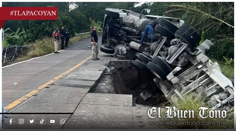 Tlapacoyan, Ver.- El desplome de un tramo de la carretera Tlapacoyan-Plan de Arroyos dejó al descubierto el pésimo trabajo realizado en una obra que, lejos de resolver un socavón histórico, terminó agravando el riesgo para los habitantes de la región. La mañana de este jueves, un tractocamión tipo góndola volcó a la altura de La Lagunilla cuando el pavimento -visiblemente debilitado- cedió bajo su peso, fracturando medio carril y derrumbando parte del concreto hidráulico que se suponía debía reforzar la zona.