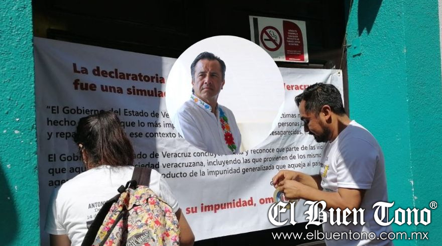 Xalapa.- Familias de desaparecidos colocaron una lona en el edificio que alberga la Comisión Estatal de Búsqueda a cargo de Brenda Cerón Chagoya, exhibiendo que la declaratoria por emergencia de personas desaparecidas, que decretó el gobernador Cuitláhuac García, es sólo una simulación.