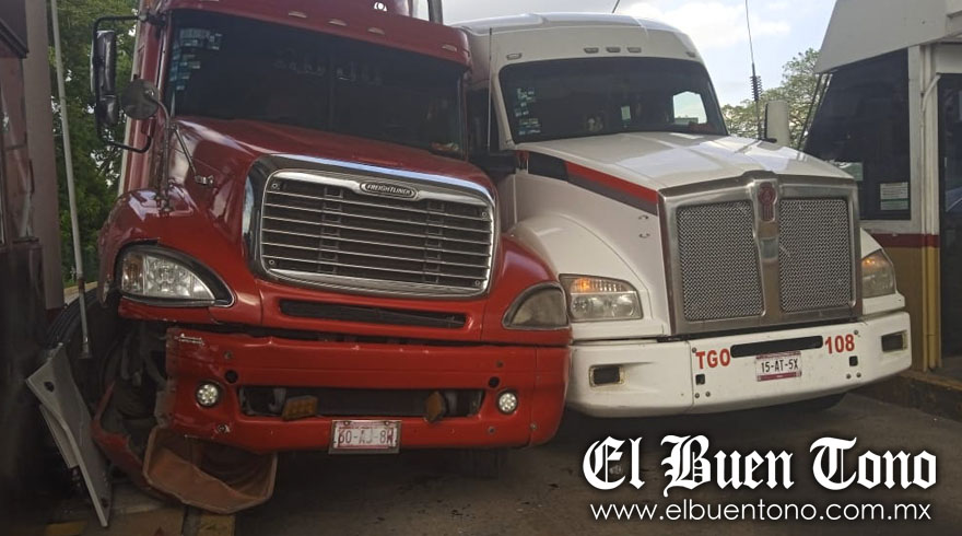 El percance se registró la tarde de ayer, luego de que los conductores de los dos tractocamiones circulaban a exceso de velocidad e intentaron ganar el paso para ingresar a la caseta de peaje, por lo que colisionaron de forma lateral.