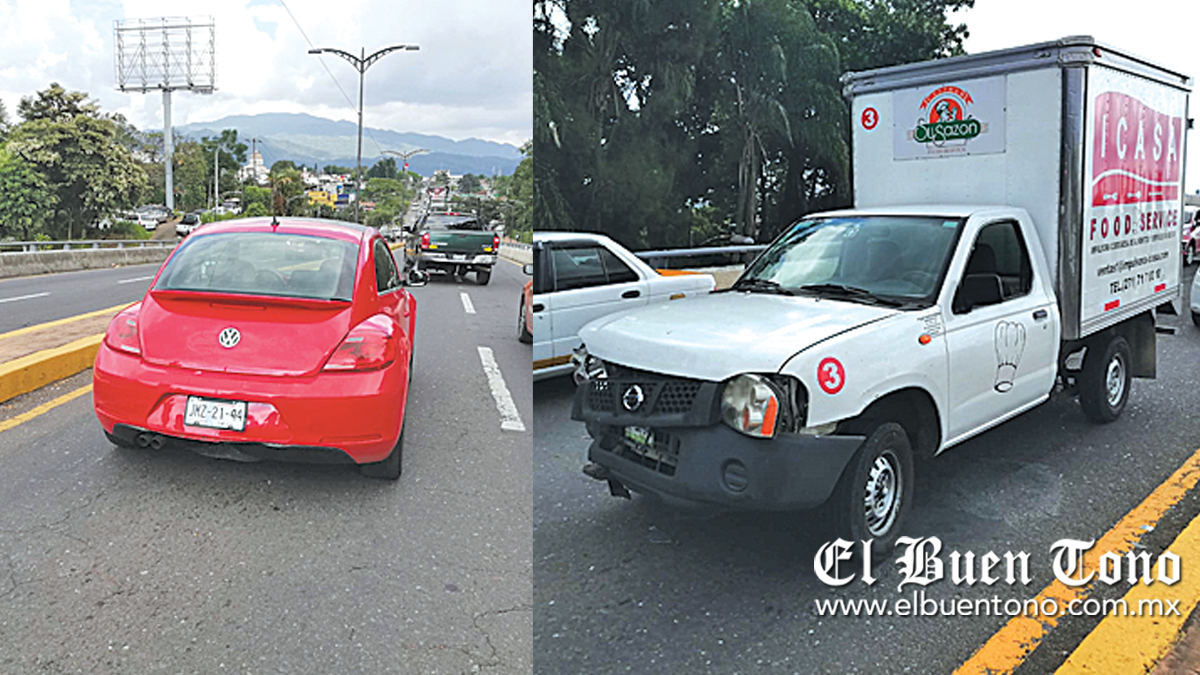 Córdoba.- Un choque por alcance entre un vehículo Volkswagen-Beetle así como una camioneta Nissan con caja cerrada, provocó el caos vehicular cuando circulaban sobre el puente a desnivel del bulevar Tratados de Córdoba, cerca de Plaza Cristal, lo cual movilizó a las autoridades de Tránsito Municipal.