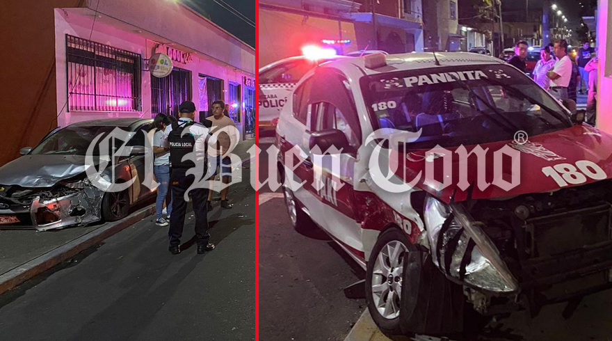Orizaba, Ver.- Daños a tres inmuebles, a la infraestructura municipal, dos vehículos chocados y una persona lesionada, dejó el choque de un taxi y un auto particular la noche de este sábado en calles al norte de Orizaba.