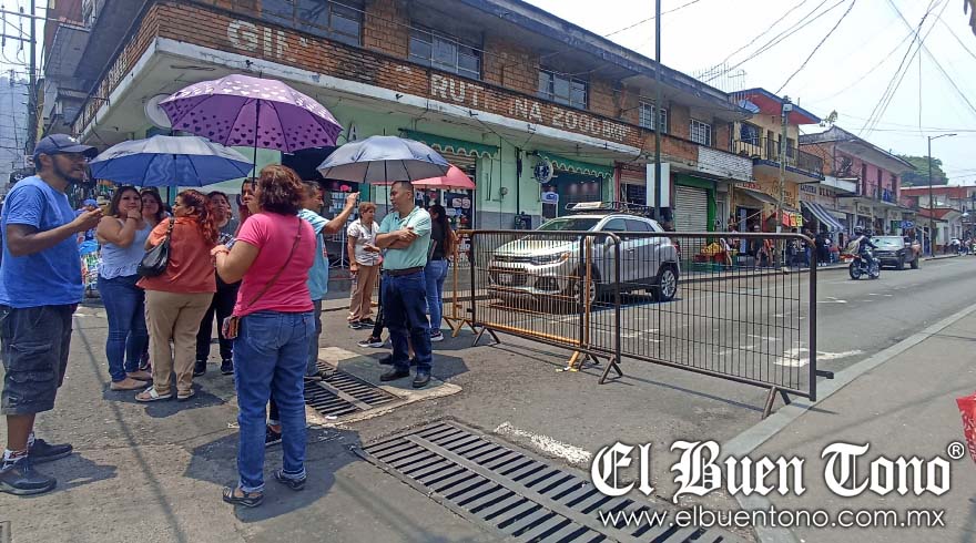 Orizaba.- Propietarios de más de 20 establecimientos cerraron la calle Norte 2 y Oriente 9 para exigir que Protección Civil restablezca la circulación peatonal en la acera de enfrente, donde colapsó la fachada de una vivienda antigua.