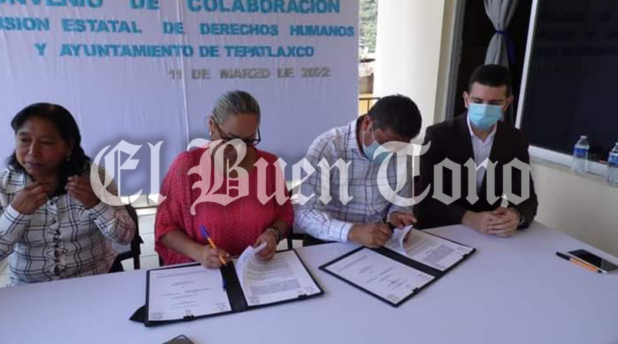 Con la presencia de autoridades municipales y la visita de la titular de la CEDH, Namiko Matzumoto Benítez, llevaron a cabo la firma de colaboración entre el Ayuntamiento de Tepatlaxco y la dependencia, con la finalidad de capacitar al personal administrativo en materia de Derechos Humanos.