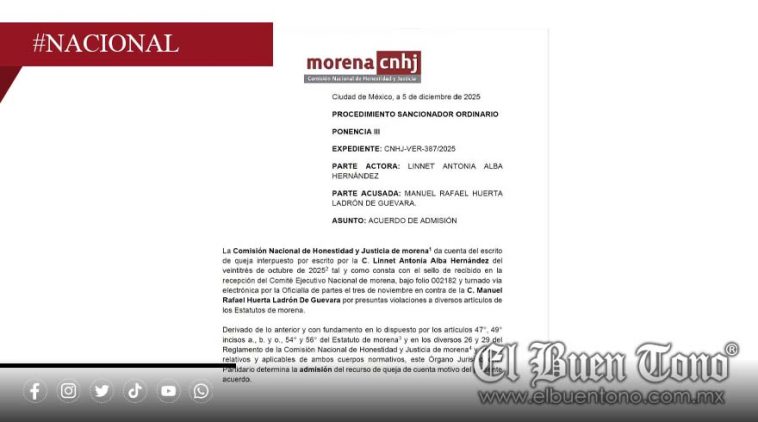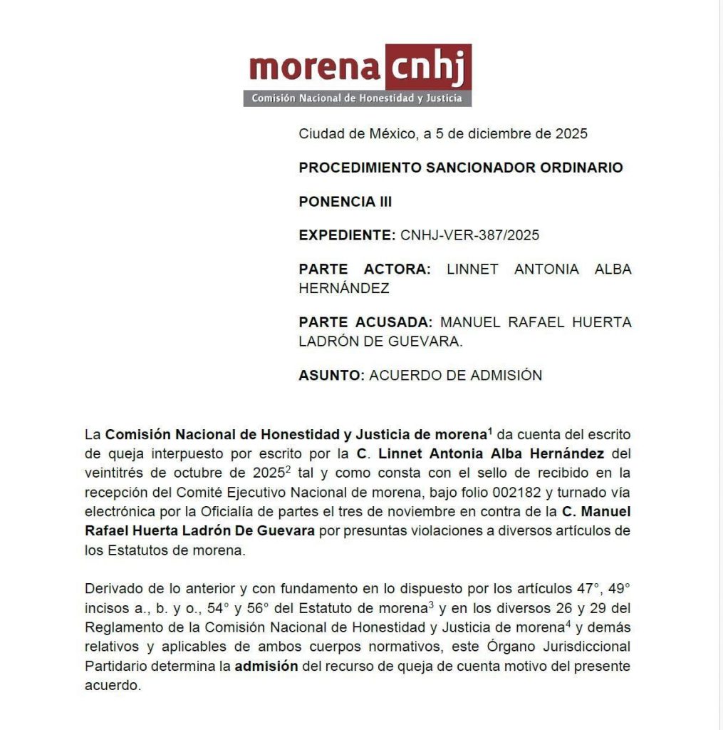 La Comisión Nacional de Honestidad y Justicia de Morena admitió una queja formal en contra de Manuel Rafael Huerta Ladrón de Guevara, quien enfrenta nuevas acusaciones internas por parte de la militante Linnet Antonia Alba Hernández, excandidata en 2021 y actual titular del Órgano Interno de Control del Ayuntamiento de Rafael Lucio.