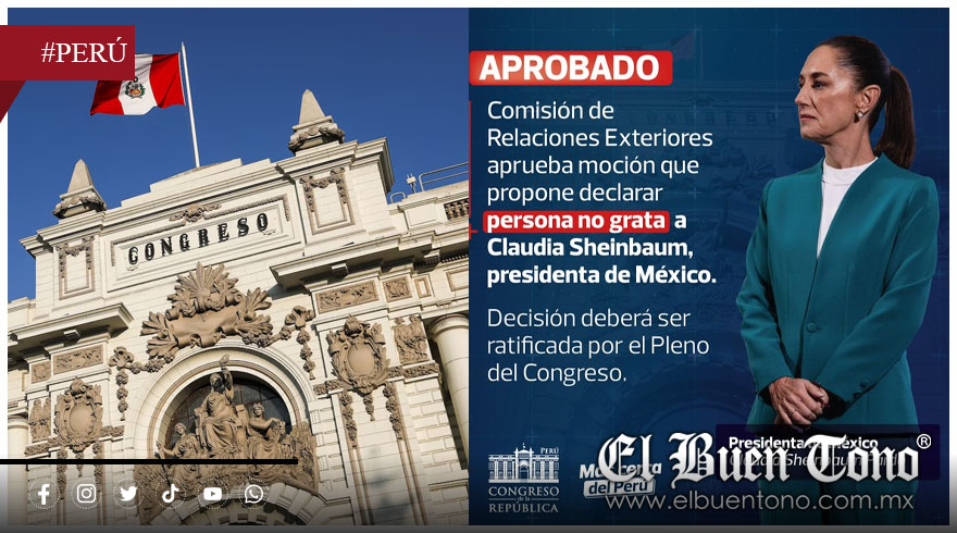 Lima.- La Comisión de Relaciones Exteriores del Congreso de la República del Perú aprobó este lunes una Moción de Orden del Día para declarar persona non grata a la presidenta de México, Claudia Sheinbaum Pardo. La decisión, que obtuvo 12 votos a favor y 6 en contra, deberá ser ratificada por el Pleno del Congreso para adquirir carácter definitivo.
