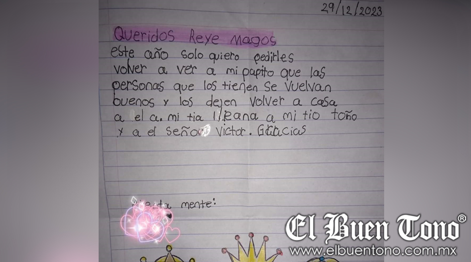 Ciudad Mendoza, Ver.- En vísperas de la llegada de los tres Reyes Magos, la hija de Honorio López Espidio, uno de los desaparecidos de Ciudad Mendoza, redactó a los magos de oriente, y como único deseo pidió volver a su padre.