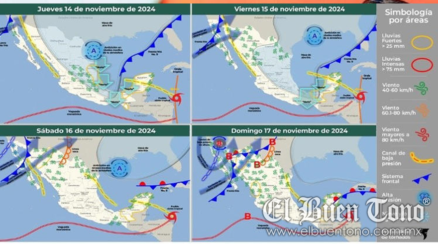 Nacional.- El Servicio Meteorológico Nacional de la Comisión Nacional del Agua (Conagua) informa sobre condiciones meteorológicas complejas que afectarán a diversas regiones de México desde la noche del miércoles 13 y durante el jueves 14 de noviembre de 2024. El desplazamiento de los frentes fríos No. 9 y No. 10, un evento de “Norte” y la presencia de un potencial ciclón tropical en el Caribe figuran entre los fenómenos que incidirán en el clima del país.